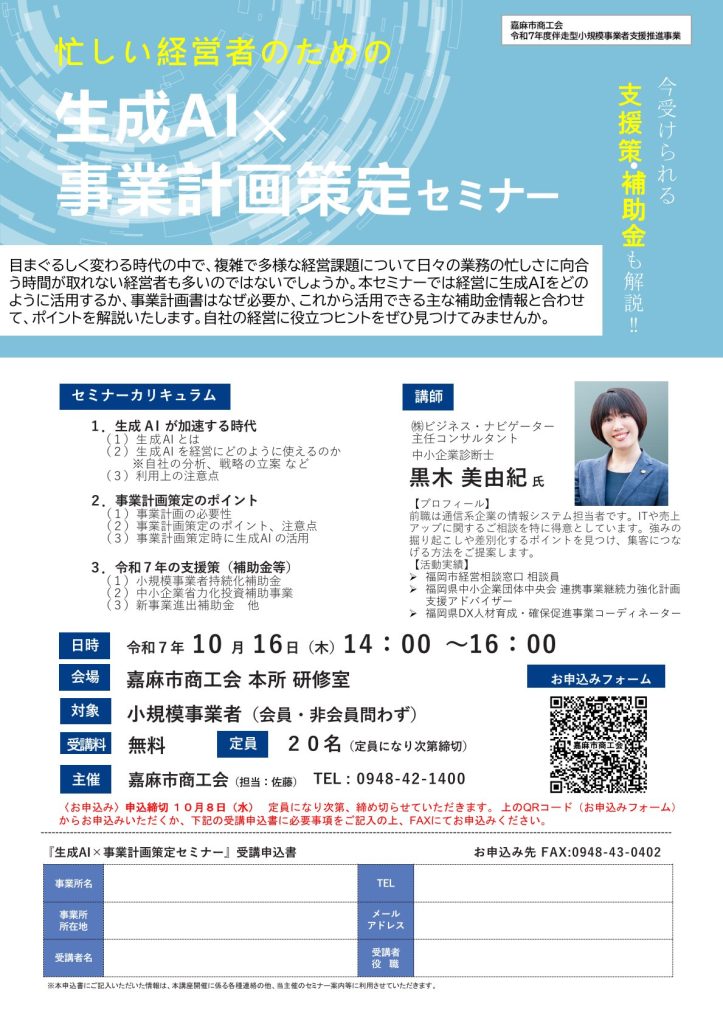 10月16日に嘉麻市商工会で開催される「AIを活用した事業計画策定セミナー」の講師を務めさせていただきます。