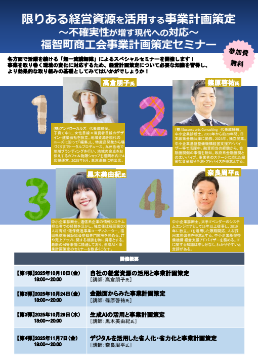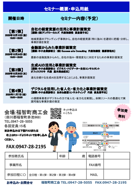 10月29日に福智町商工会で開催される「生成AIの活用と事業計画策定」セミナーの講師を務めさせていただきます。